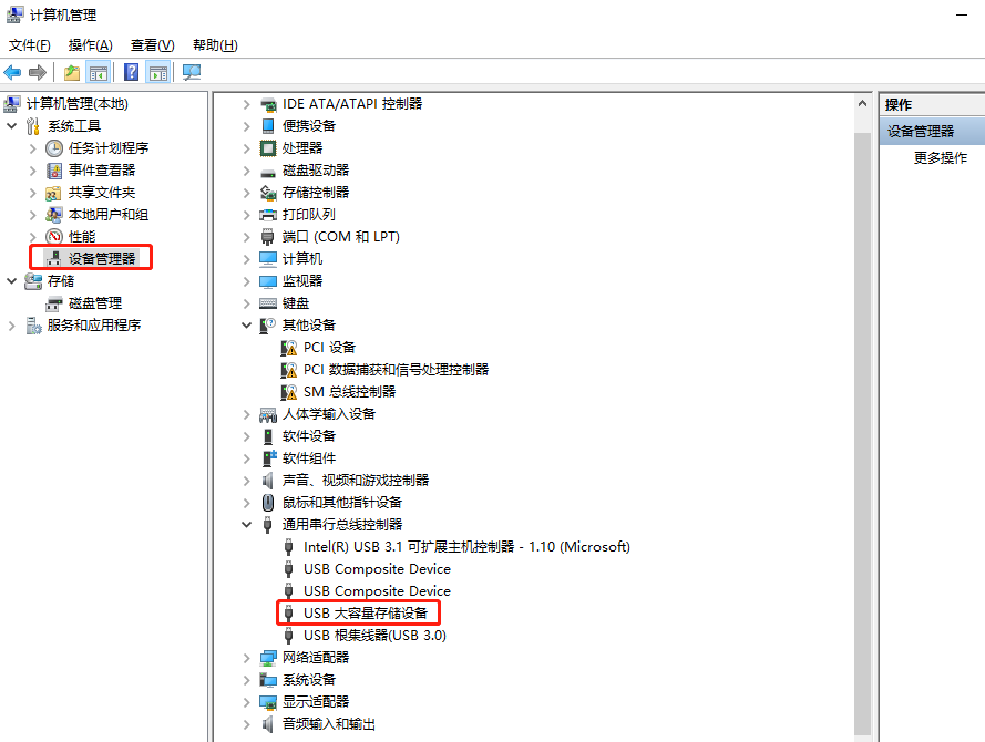 鼠标右键【我的电脑】-【管理】,在弹出的窗口,点击【系统工具】-【设备管理器】,在右侧找到【通用串行总线控制器】-【USB大容量存储设备】双击打开;