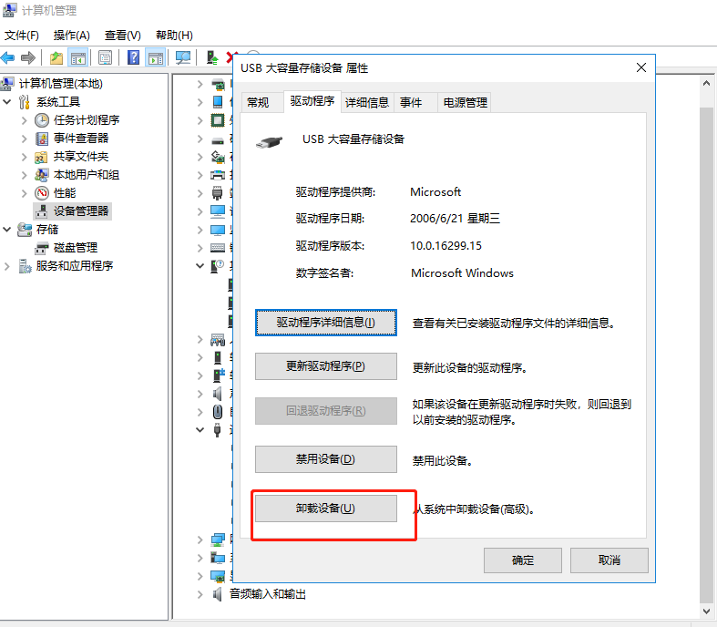 在弹出的窗口,点击【驱动程序】-【卸载设备】-【确定】,卸载完成后,将U盘重新插入电脑看是否能被读取。