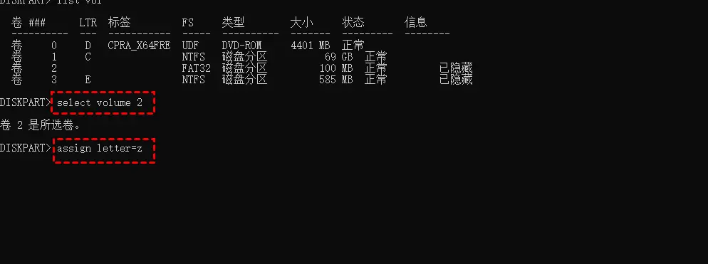 assign letter=z (给这个分区分配一个盘符,以便修复它)
