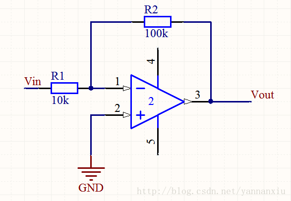 说明:由欧姆定律和基尔霍夫定律,得:Gain = Vout/Vin = - R2/R1,即Vout = -R2/R1 × Vin