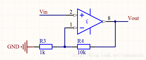 说明:由欧姆定律和基尔霍夫定律,得:Gain = Vout/Vin =1 + R4/R3,即:Vout = (1 + R4/R3)× Vin