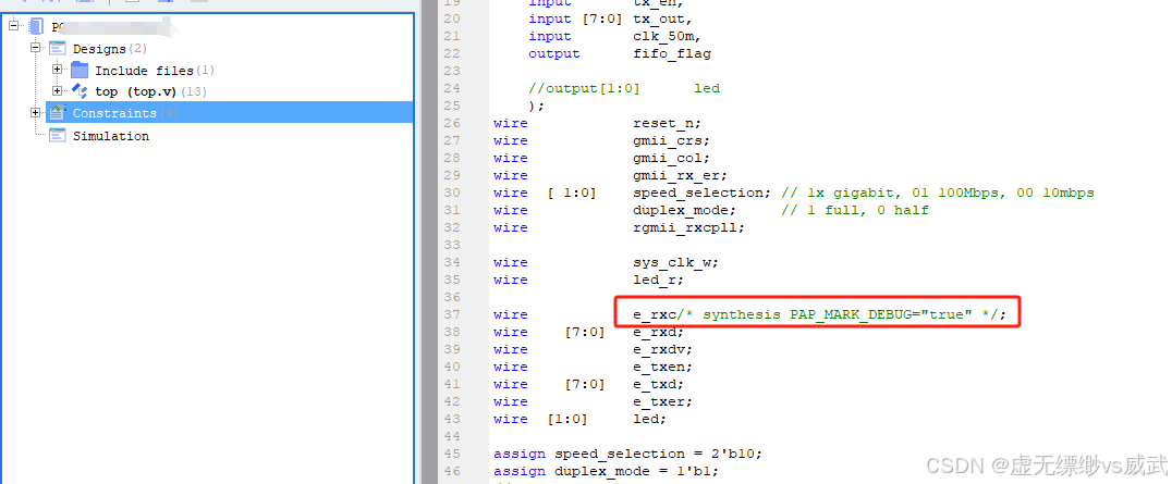 我们只需在像下面红框 /* synthesis PAP_MARK_DEBUG="true" */ 添加这部分关键字,重新编译后,就可以抓取我们被优化掉的管脚