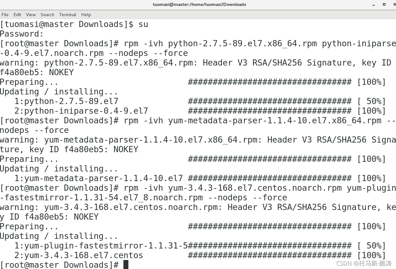 rpm -ivh yum-3.4.3-168.el7.centos.noarch.rpm yum-plugin-fastestmirror-1.1.31-54.el7_8.noarch.rpm --nodeps --force