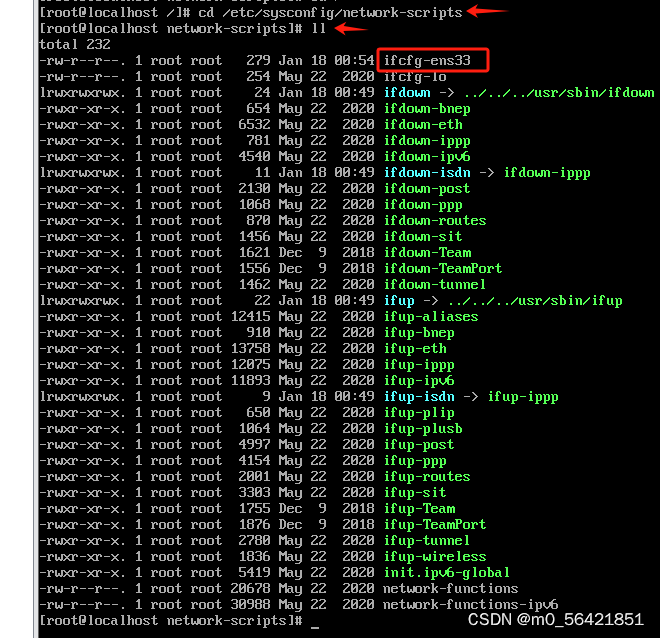 2.运行命令cd /etc/sysconfig/network-scripts进入network-scripts目录下,并找到ifcfg-ens33文件
