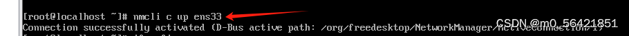 方法一:直接启动网卡:nmcli c up ens33方法二:修改配置:运用vi命令将ifcfg-ens33中的ONBOOT改为yes