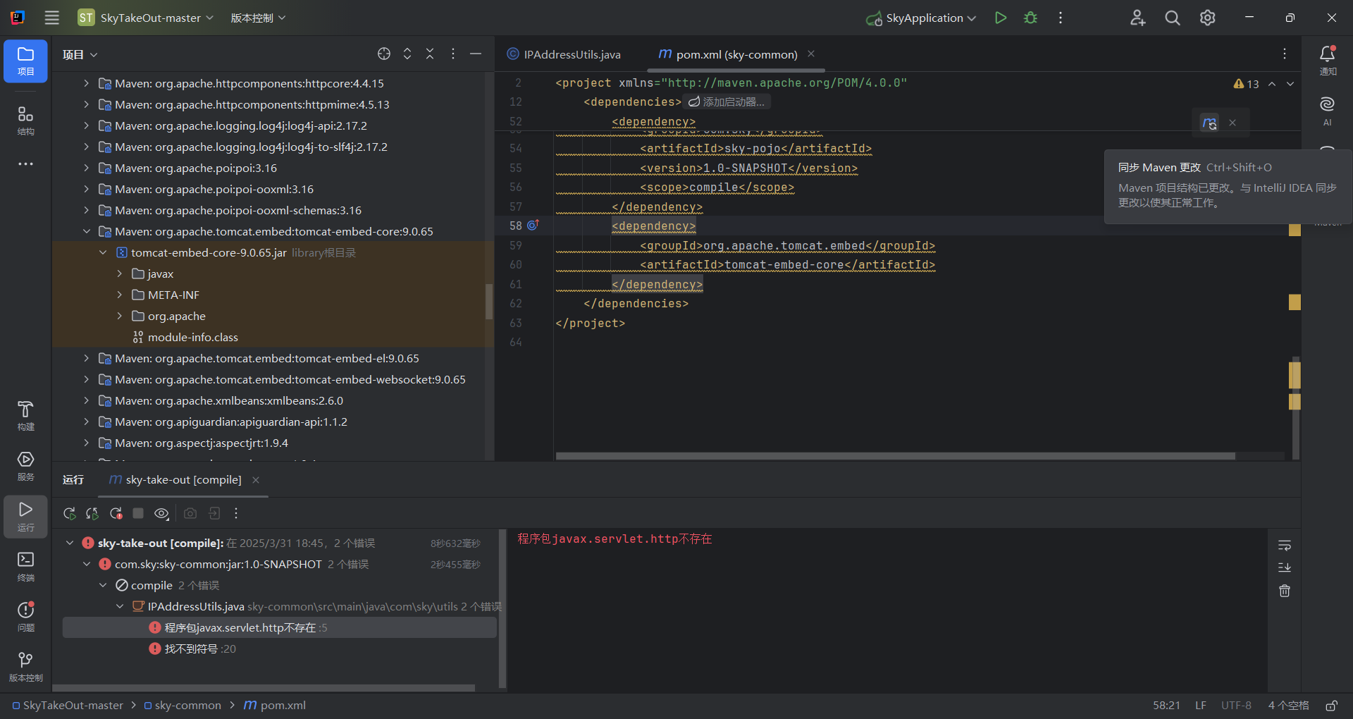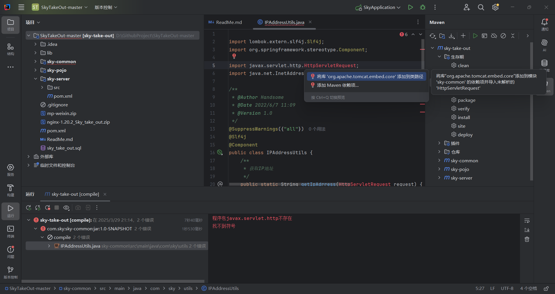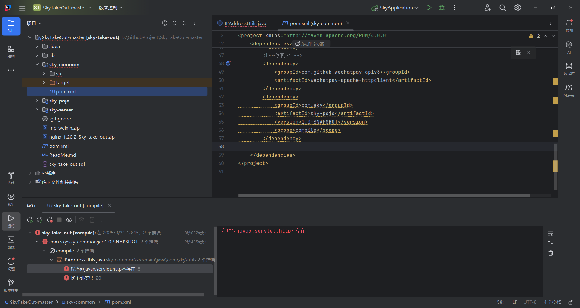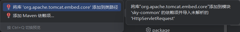 先看问题,说的是sky-common这个项目程序包javax.servlet.http不存在,那就在这个项目动手脚。