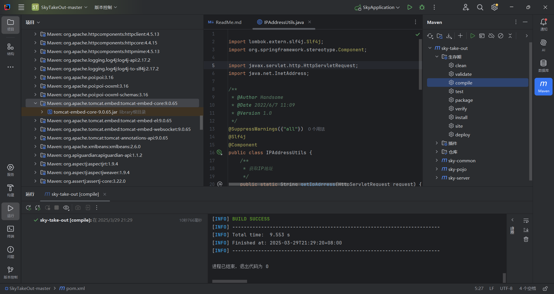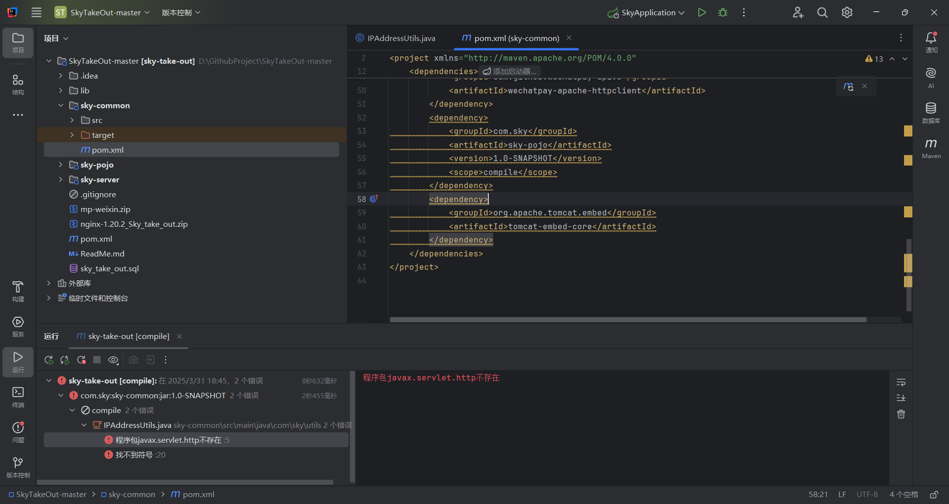 点击sky-common项目的pom.xml文件。将下面这段依赖信息编写进pom.xml,如下图。