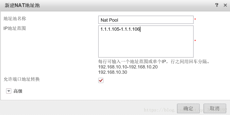 首先,防火墙上新建一个Nat Pool,供内网用户以NAT方式访问外网