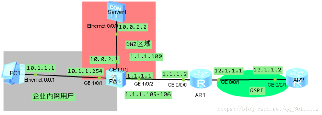 PC1是Trust区域、Server是DMZ区域,AR1、AR2是Untrust区域。