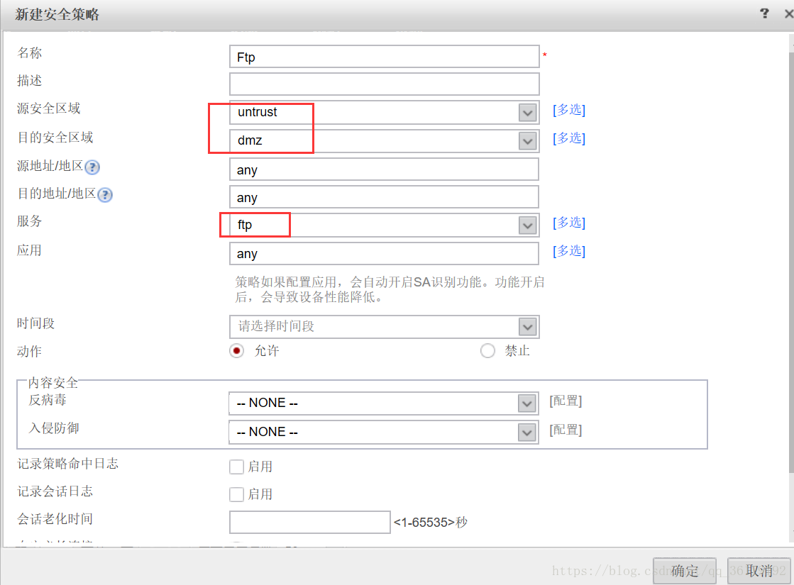 在防火墙上配置一个策略,使得untrust区域能访问DMZ区域