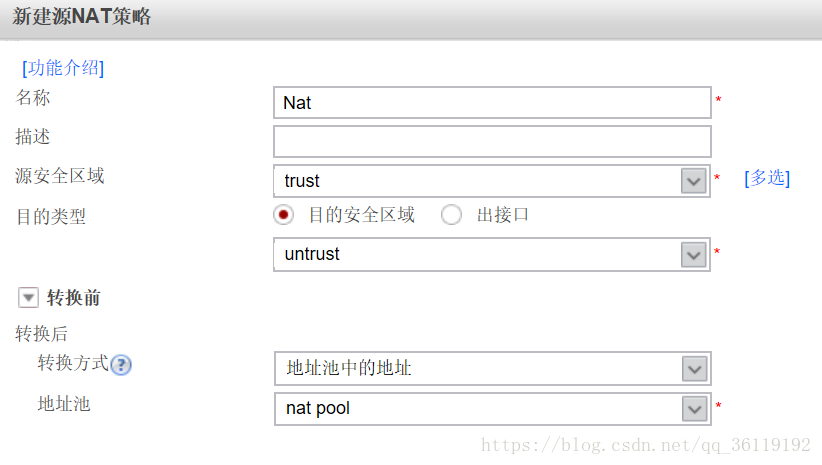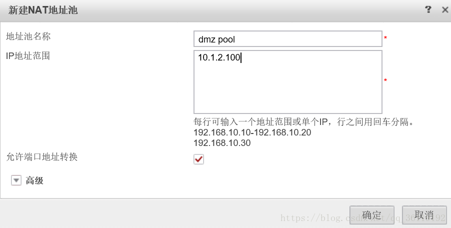 接着在配置一个nat pool地址池,目的是作为外网用户访问内网服务器后nat的内网地址