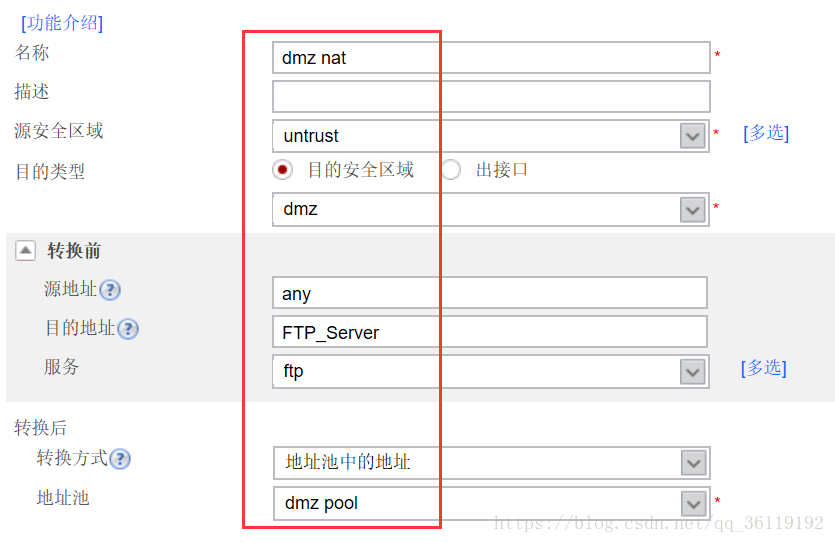 nat address-group "dmz pool" 1 //外网访问ftp服务器的内网地址池