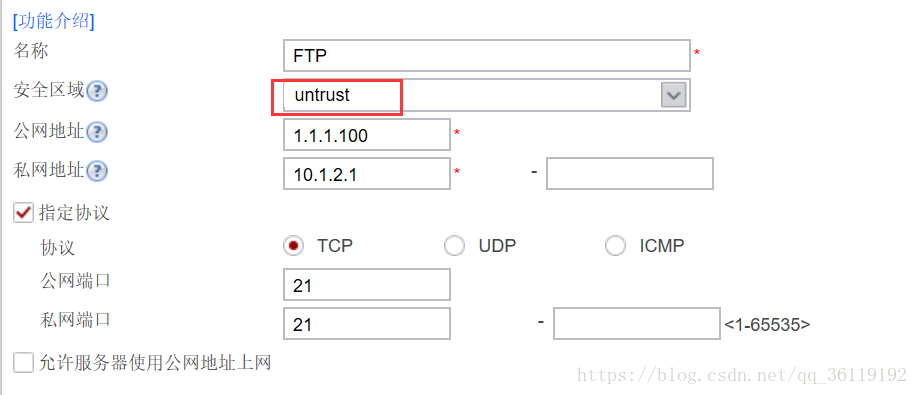 nat server FTP 0 zone untrust protocol tcp global 1.1.1.100 ftp inside 10.1.2.1 //静态映射