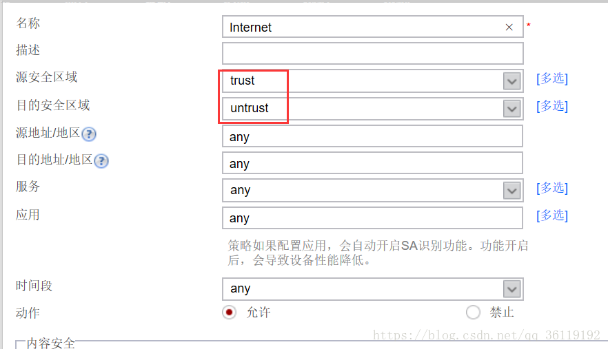 然后再防火墙上配置一个策略,使得trust区域可以访问untrust区域