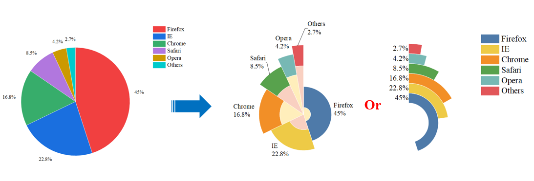 传统的饼图只能通过不同扇形区域的的面积大小(=每个扇形的角度)显示数据比例,但当数据差异较小时,视觉上难以清晰地比较数据大小,且传统饼图显得不是特别好看。