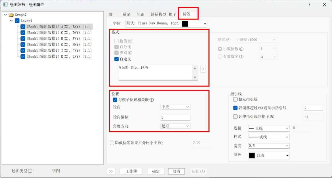 6.在标签对话框下,格式选择勾选百分比和类别,并自定义格式,位置径向偏移修改为5,角度方向改为“起点”。