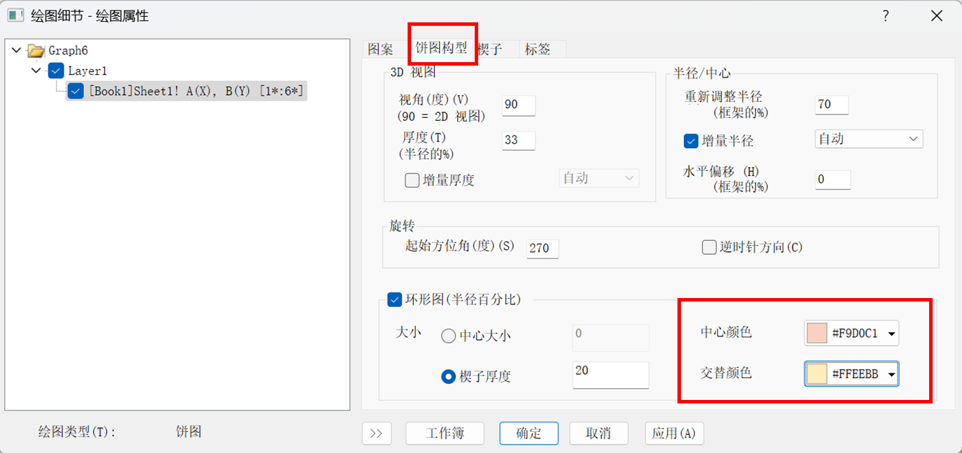 4.接着对其进行细节美化,双击图形,在饼图构型对话框下,修改其中心颜色和交替颜色,改为自己喜欢的颜色;