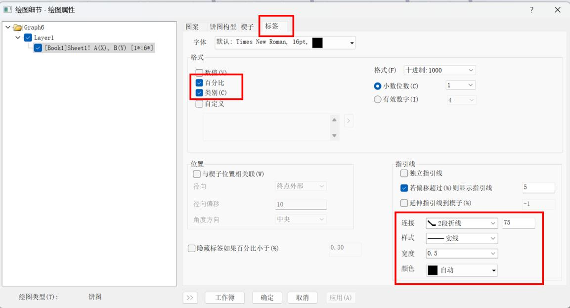 5.在标签对话框下,格式选择百分比、类别,连接选择为“2段折线”;