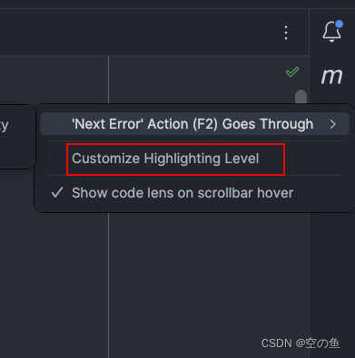 有时候想去掉idea中那些黄色的红色的warning波浪线,这些不是错误,并不影响执行,一直显示显得让人很烦躁,去"Editor" -> "Inspections"中一个个设置很麻烦。在idea右侧滚动条的一侧右键,选择”Customize Highlighting Level“设置检测级别,设置成syntax或none就可以去掉那些烦人的波浪线。