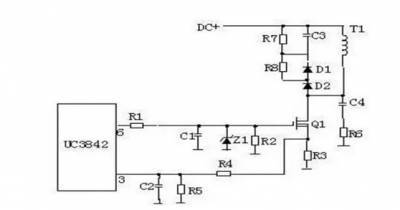 R4、C3、R5、R6、C4、D1、D2组成缓冲器,和开关MOS管并接,使开关管电压应力减少,EMI减少,不发生二次击穿。在开关管Q1关断时,变压器的原边线圈易产生尖峰电压和尖峰电流,这些元件组合一起,能很好地吸收尖峰电压和电流。从R3测得的电流峰值信号参与当前工作周波的占空比控制,因此是当前工作周波的电流限制。当R5上的电压达到1V时,UC3842停止工作,开关管Q1立即关断。R1和Q1中的结电容CGS、CGD一起组成RC网络,电容的充放电直接影响着开关管的开关速度。R1过小,易引起振荡,电磁干扰也会很大;R1过大,会降低开关管的开关速度。Z1通常将MOS管的GS电压限制在18V以下,从而保护了MOS管。Q1的栅极受控电压为锯形波,当其占空比越大时,Q1导通时间越长,变压器所储存的能量也就越多;当Q1截止时,变压器通过D1、D2、R5、R4、C3释放能量,同时也达到了磁场复位的目的,为变压器的下一次存储、传递能量做好了准备。IC根据输出电压和电流时刻调整着脚锯形波占空比的大小,从而稳定了整机的输出电流和电压。C4和R6为尖峰电压吸收回路。