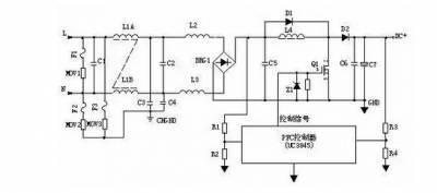 输入电压经L1、L2、L3等组成的EMI滤波器,BRG1整流一路送PFC电感,另一路经R1、R2分压后送入PFC控制器作为输入电压的取样,用以调整控制信号的占空比,即改变Q1的导通和关断时间,稳定PFC输出电压。L4是PFC电感,它在Q1导通时储存能量,在Q1关断时施放能量。D1是启动二极管。D2是PFC整流二极管,C6、C7滤波。PFC电压一路送后级电路,另一路经R3、R4分压后送入PFC控制器作为PFC输出电压的取样,用以调整控制信号的占空比,稳定PFC输出电压。