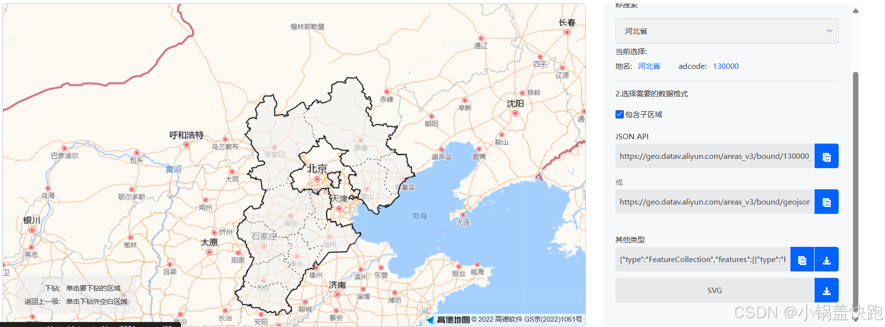 我们可以通过 阿里云数据可视化平台 ,可以获取到中国各个省份/区级/县级的json数据,但是区级和县级,并没有包含街道和乡镇的数据