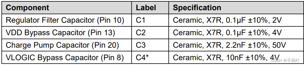 那么20脚的作用是什么呢,笔者就翻开数据手册查看,CPOU功能是这么描述的:板载电荷泵产生MEMS(微机电系统)振荡器所需的高电压。关于电荷泵的相关知识大家可查看这篇知乎charge pump的原理介绍 - 知乎 (zhihu.com)。数据手册上推荐引脚CPOUT的电容就是2.2nF,数据手册推荐的电路图如图2所示,推荐的电容值如表1所示:
