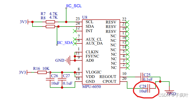 图1是有问题的电路原理图,在网上随意找的一个电路参考,结果就翻车了。能够读取MPU6050的ID值(0x68),但在读取三轴加速度、三轴角速度的运动数据以及温度数据时,读取的数据值都为零。刚开始以为是软件IIC读取时序不对,但用示波器观察波形时,发现时序没有问题,但读数据值的时侯就一直低电平(值为零)。在查看网坛上的一些电路参考,发现20脚的电容C28值有些异同,说法是10uF和2.2uF都可以,先前也觉得电容值差别不大就没管。结果确实是这个电容的问题,将这个电容换成2.2uF就可以读出数据值了。