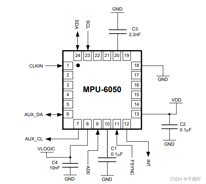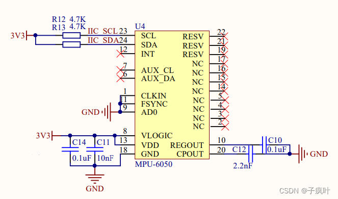 近期自己画一个MPU6050模块,电路设计只实现基本读取数据功能。在网上参考了不少的电路原理图,都大同小异,在一些电容电阻的取值有些许不同。笔者在实现电路时遇到了MPU6050能读ID但读值为零的硬件电路问题,经过许久调试最终能够读取数据值,在这里做个记录,希望对遇到同样问题的伙伴能有所帮助。