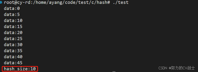和预期一致,这里hash_size表示桶深,表示槽位0(也就是数组下标为0的纵向链表)下挂载了多少个数据节点。感兴趣的同学可以自己试验一下,理论上每个槽位下都挂载了10个数据节点,一共5个槽位,加起来正好50个数据节点。