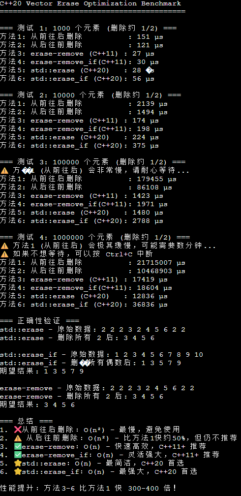 std::cout << "3. ✅ erase-remove:O(n) - 快速高效,C++11+ 推荐\n";