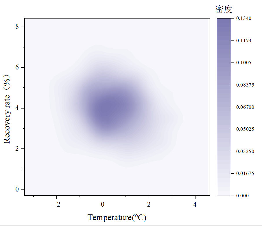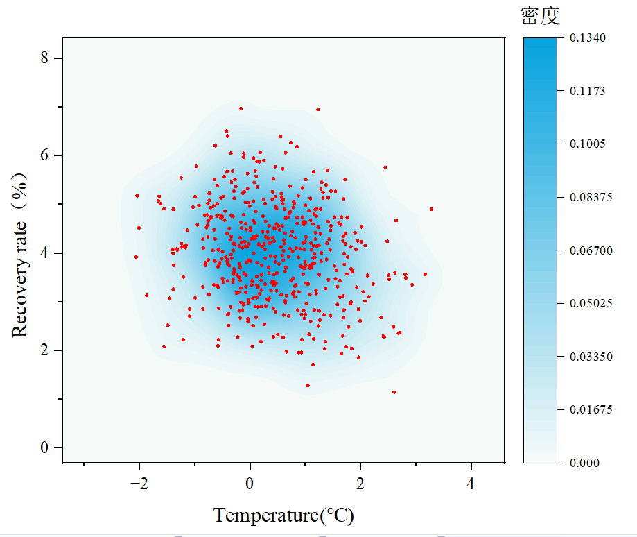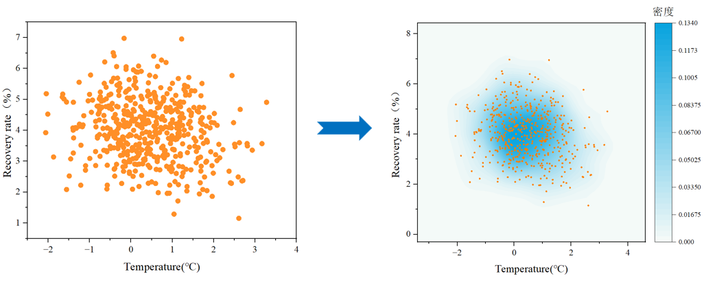以上就是绘制密度散点图的基本步骤,大家根据以上步骤即可绘制出密度散点图。相比于普通散点图,密度散点图的高密度区域表示数据点或观察值更为集中,而低密度区域表示数据分散或稀疏,更直观地表示数据的分布情况。