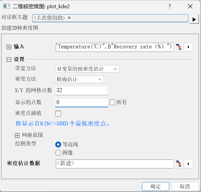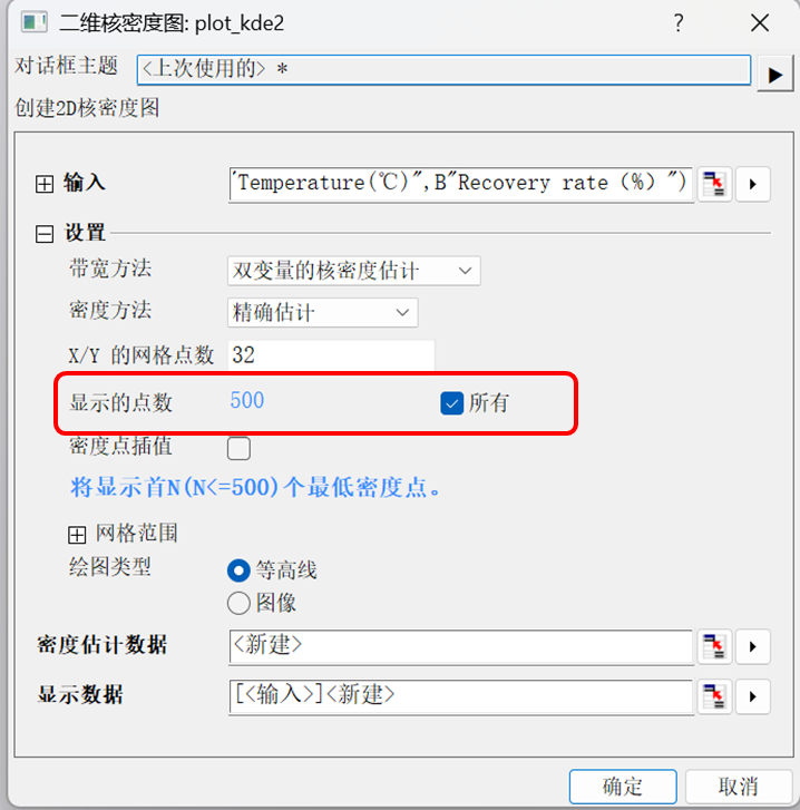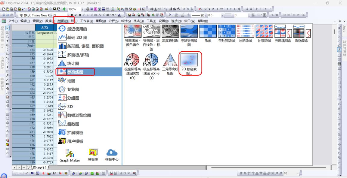 2.选中所有的数据,点击绘图—等高线图—2D核密度图;