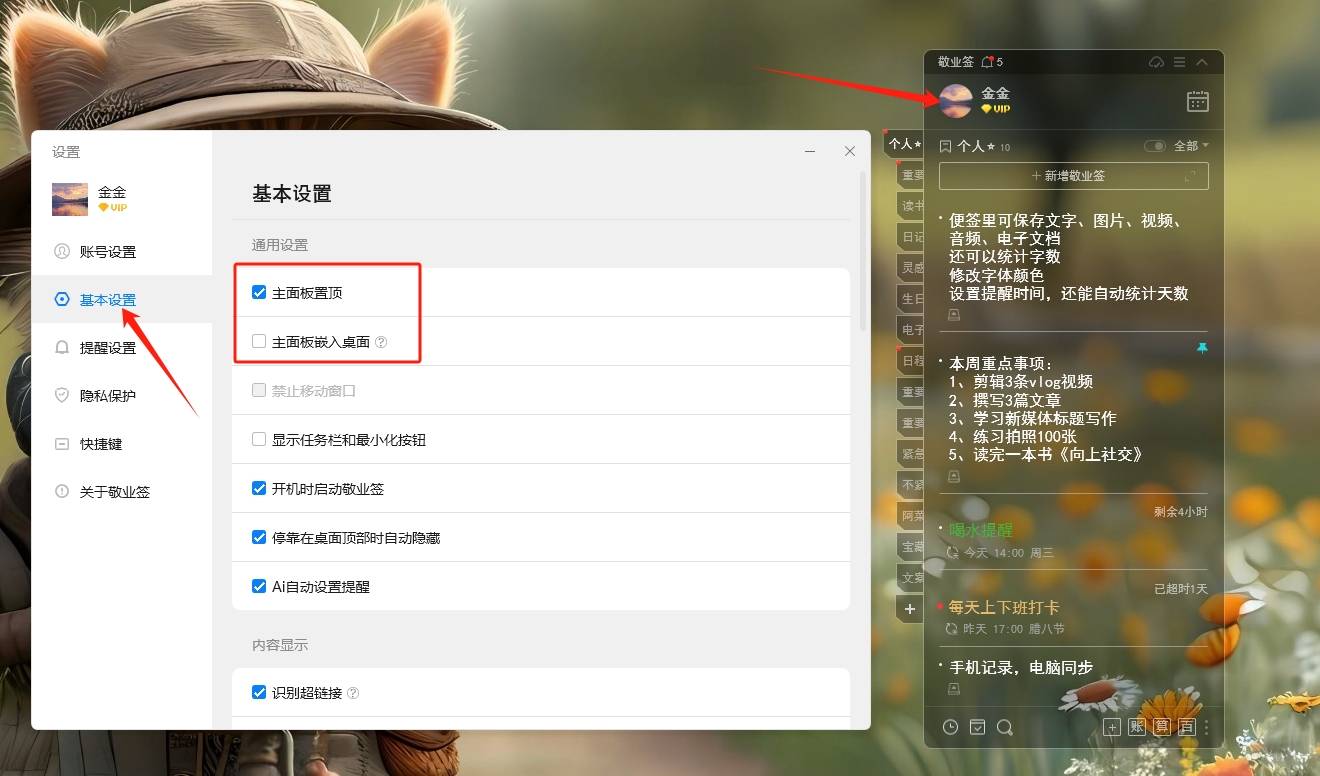 在基本设置中,勾选“主面板置顶”,便签界面可以一直位于桌面顶层显示,不会被其他页面遮挡,鼠标拖动界面可自由移动位置;