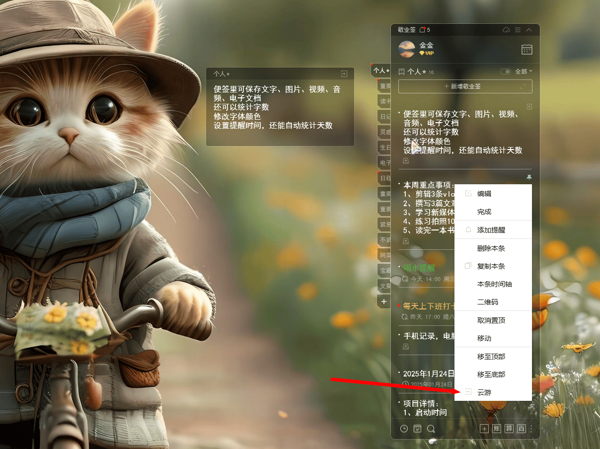 鼠标右键点击单条便签,勾选“云游”,此条便签就会独立添加到桌面上显示;在待办分类中,点击右上角的“。。。”,勾选“云游”,本条待办分类也会独立显示到桌面上。