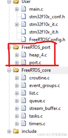 portable文件夹下只需要添加对应编译器和芯片架构的文件,对于 Keil5 和 STM32F103,需要添加portable\RVDS\ARM_CM3文件夹下的port.c和portmacro.h,以及portable\MemMang文件夹下的heap_4.c。