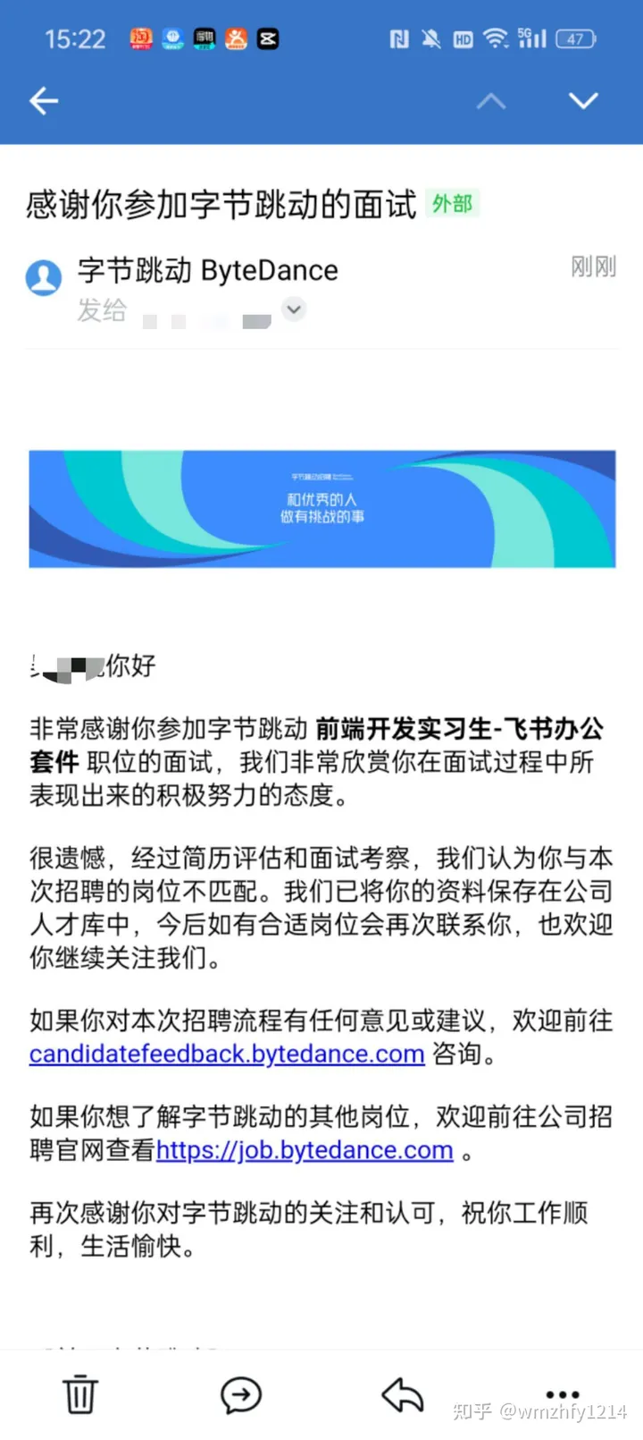 考核完代码就结束了,听说别的字节都要面一个多小时,我一共44分钟就结束了,面试官问我有没有想问的,我就问问他觉得我今天的表现有没有机会。他很尴尬地笑,说我项目比较有特色但是基础不太扎实,需要加强基础知识的学习。果然,今天就收到了没通过的邮件。