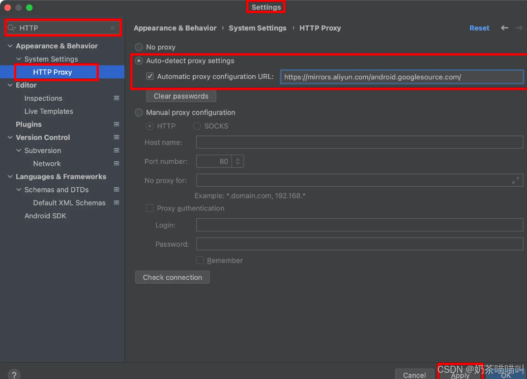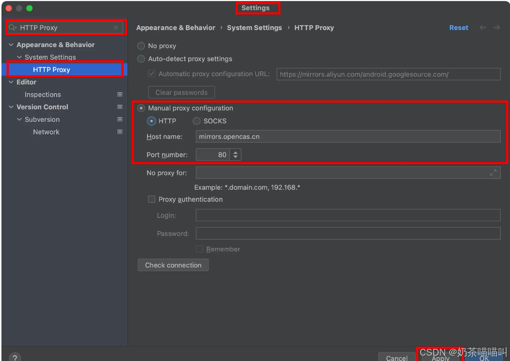 打开 Settings,搜索 HTTP Proxy,然后填入镜像地址,点击 Apply,在点击 OK。