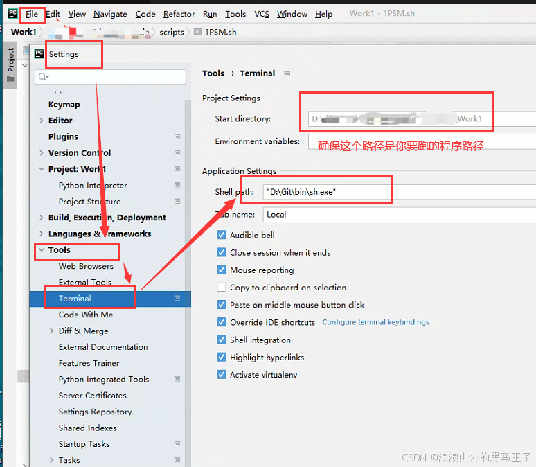 3.打开PyCharm,点击File-->>settings(小扳手的形状)-->>Tools-->>Terminal-->>Shell path,打开第一步中找到的Git所在的位置,找到bin目录下sh.exe。注意!!路径要用英文的双引号("D:\Git\bin\sh.exe")引起来!!如下所示: