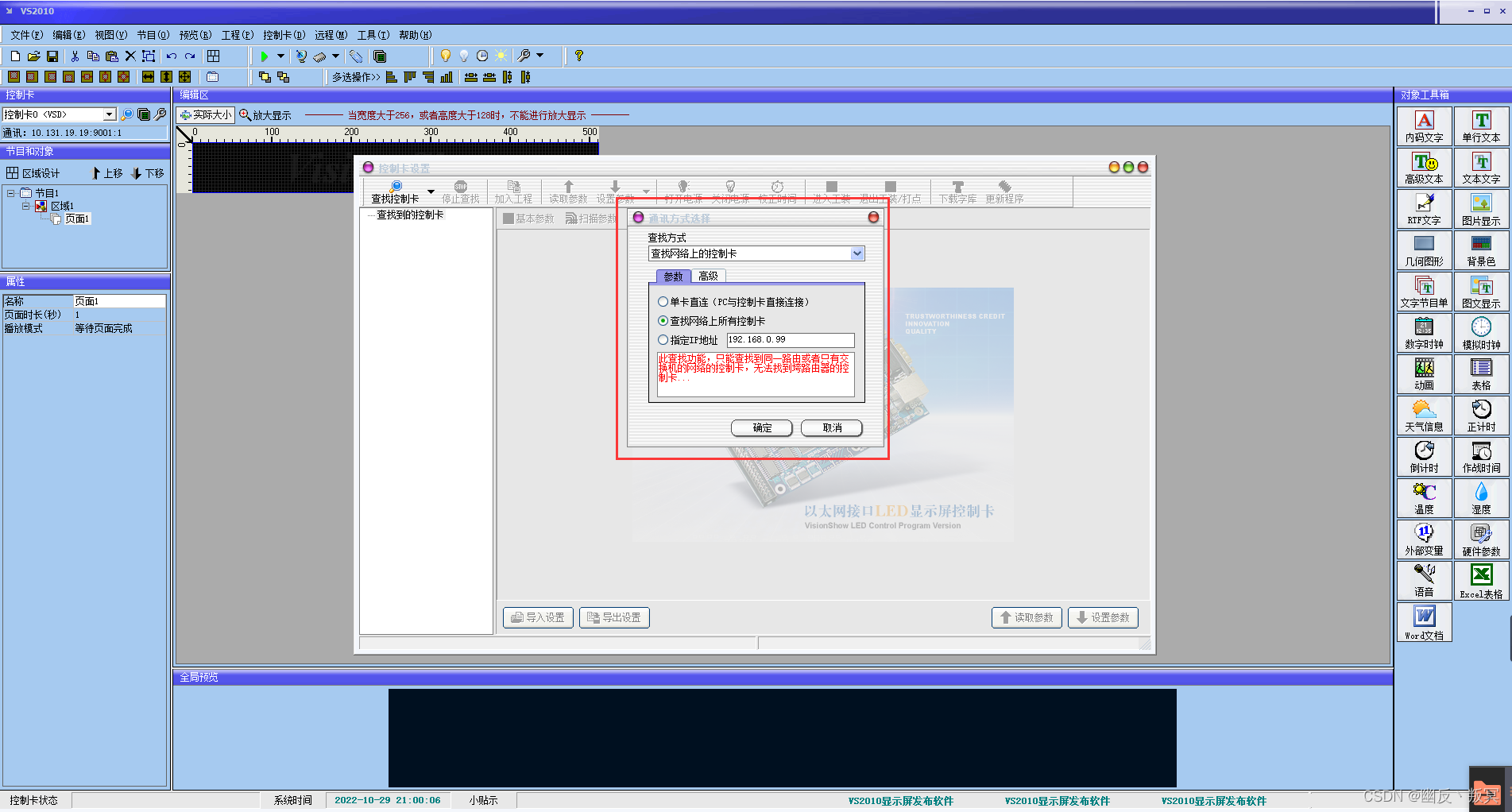 打开官方的控制软件,共计有三种连接方式,控制卡出厂 IP地址为 192.168.0.99 ,在初次连接时候,可以用一根网线将控制卡和电脑直连起来。注意:一定要将电脑的 IP地址设置为 192.168.0.xx,否则不能成功获取到。