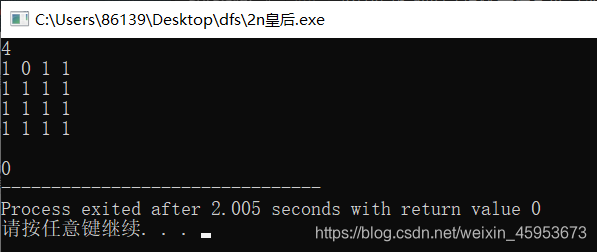接下来n行,每行n个0或1的整数。如果一个整数为1,表示对应的位置可以放皇后,如果一个整数为0,表示对应的位置不可以放皇后。