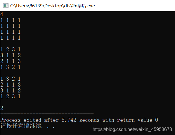 题目描述:给定一个n*n的棋盘,棋盘中有一些位置不能放皇后。现在要向棋盘中放入n个黑皇后和n个白皇后,使任意的两个黑皇后都不在同一行、同一列或同一条斜线(包括正负斜线)上,任意的两个白皇后都不在同一行、同一列或同一条斜线(包括正负斜线)上。问共有多少种放法?n<=8。输入:第一行输入一个整数n,表示棋盘的大小。接下来n行,每行n个0或1的整数。如果一个整数为1,表示对应的位置可...