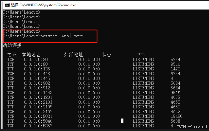 1、使用电脑快捷组合建Win+R打开快速运行,在运行窗口中输入“cmd”命令点击回车确定调出管理员命令提示符,紧接着输入“netstat -ano | more ”。这个命令可以通过Enter键进行遍历查询如下图所示: