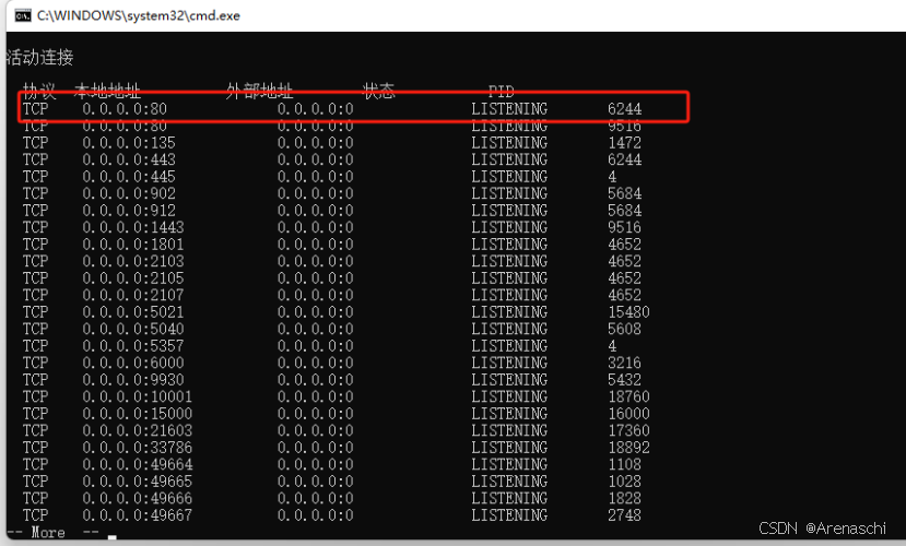 2、点击回车后,显示出一大段文字,找到 "本地地址" 为 0.0.0.0:80 的一行,在行的最后我们会看到 PID为"6244"。记住次PID;如下图所示:
