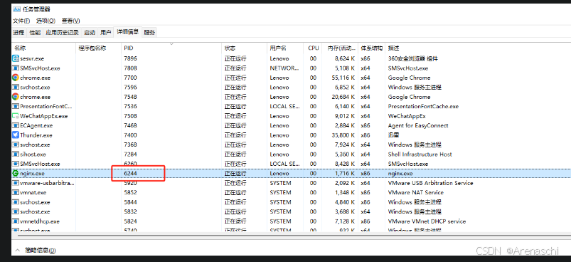 4、在进程中找到PID为"6244"的程序,如下图所示:显示80端口被pid 6244 nginx.exe占用。