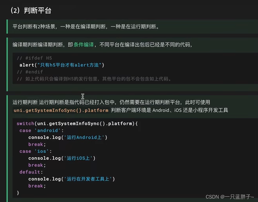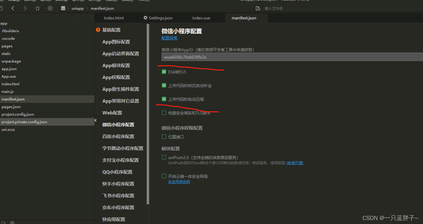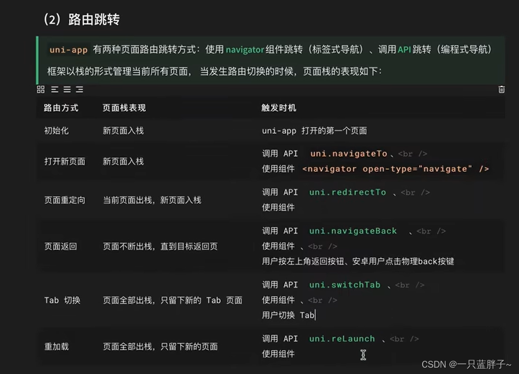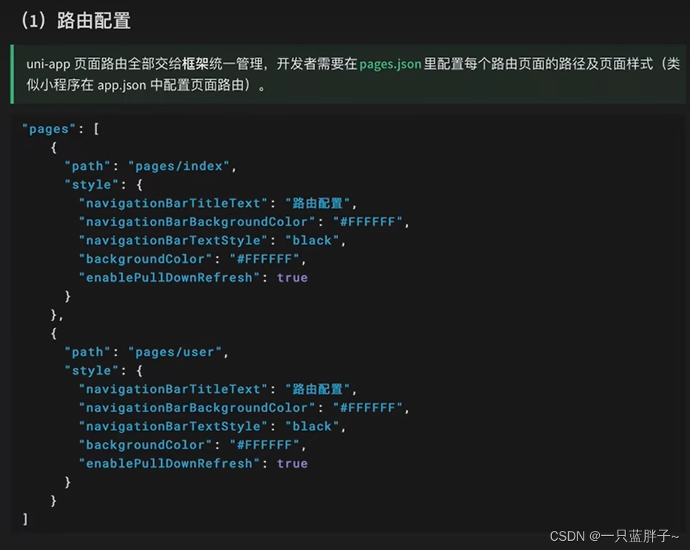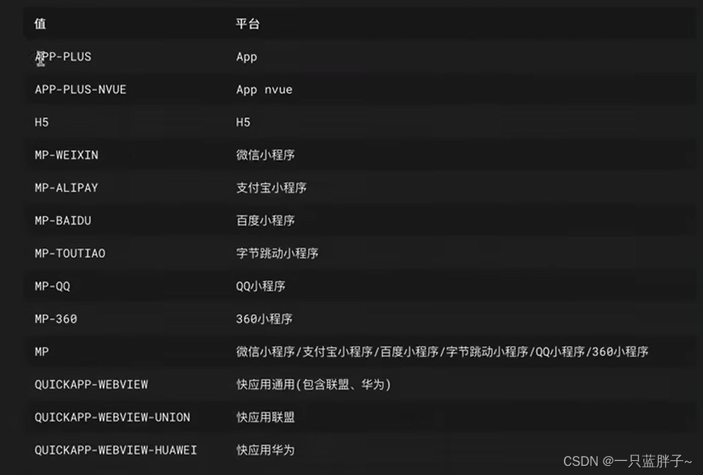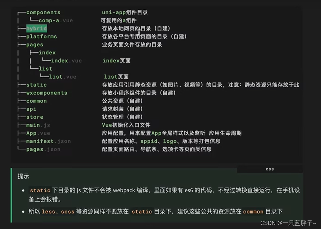 对uni-app进行全局配置的,决定页面文件的路径、窗口样式、原生的导航栏、底部的tabbar,它类似于微信开发者工具小程序中的app.json。简介:Uni-app是基于Vue+微信小程序体系,且基Uni-app可以开发 微信小程序、H5、安卓app、ios-app等多端项目。9、入口文件main.js——跟以前vue的差不多,引入vue,实例化一个对象并且挂载到页面上去。11、uni-app生