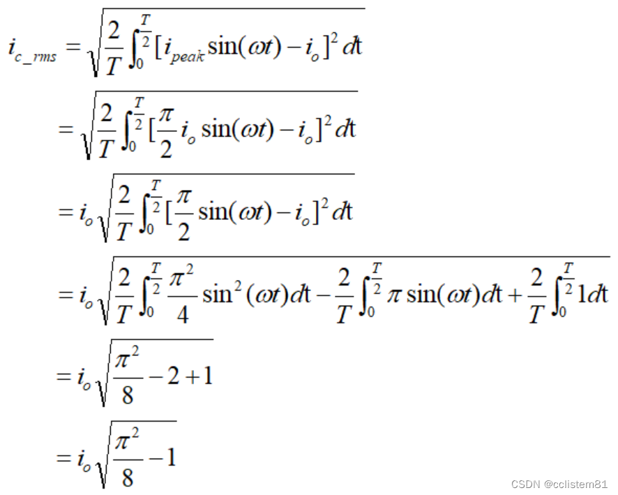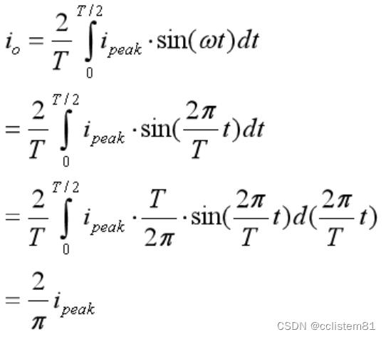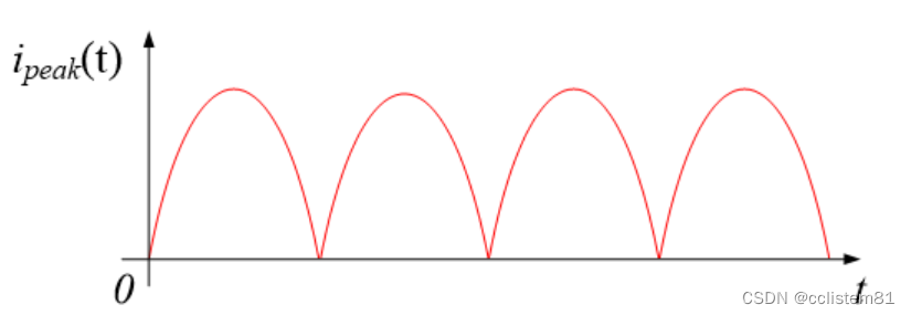 假设全波整流电流峰值为ipeak,则输出电流平均值为io:
