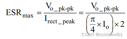 2、已知最大可允许输出电压纹波Vo_pk_pk,输出电流平均值Io,或全波/全桥整流后的电流波形峰值Irect_peak,则滤波电容的最大允许ESR为: