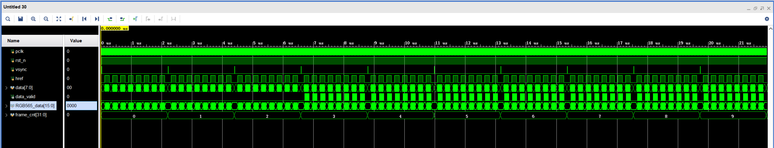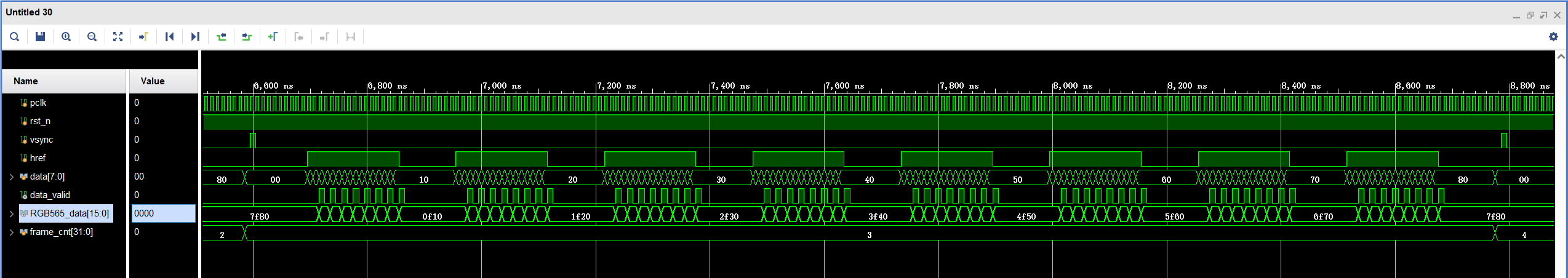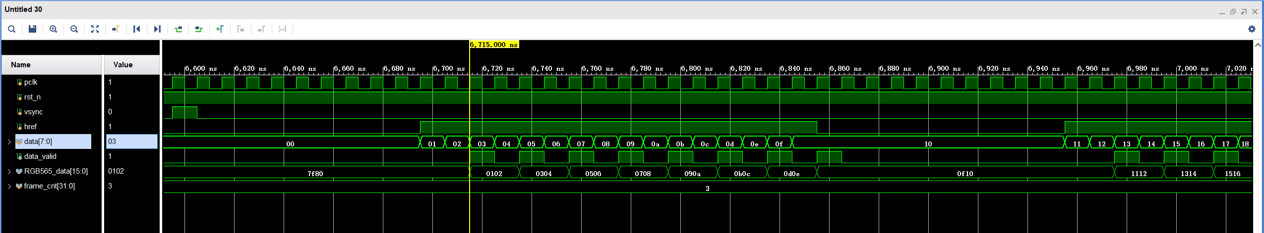 一行波形:一个RGB565像素数据对应两个8位数据,可以看到每接收2个数据就相应拼接输出1个RGB565数据,同时data_valid数据有效信号与数据同步产生。