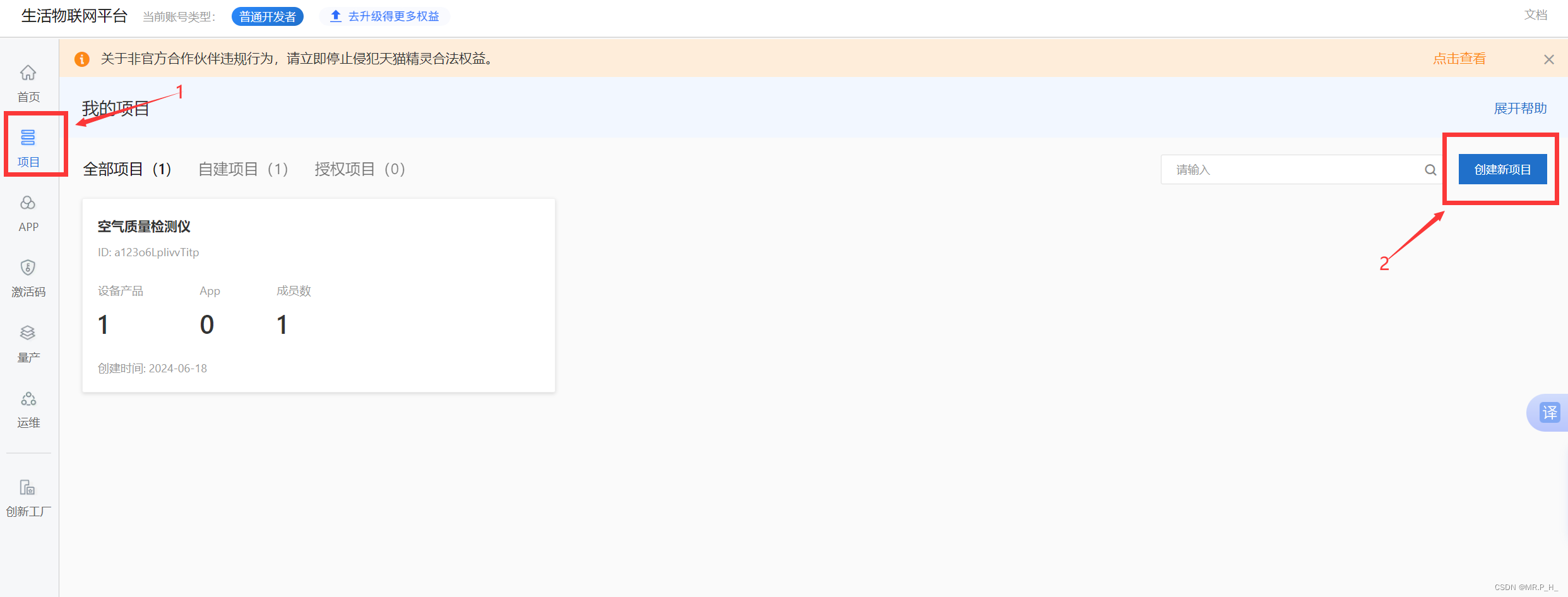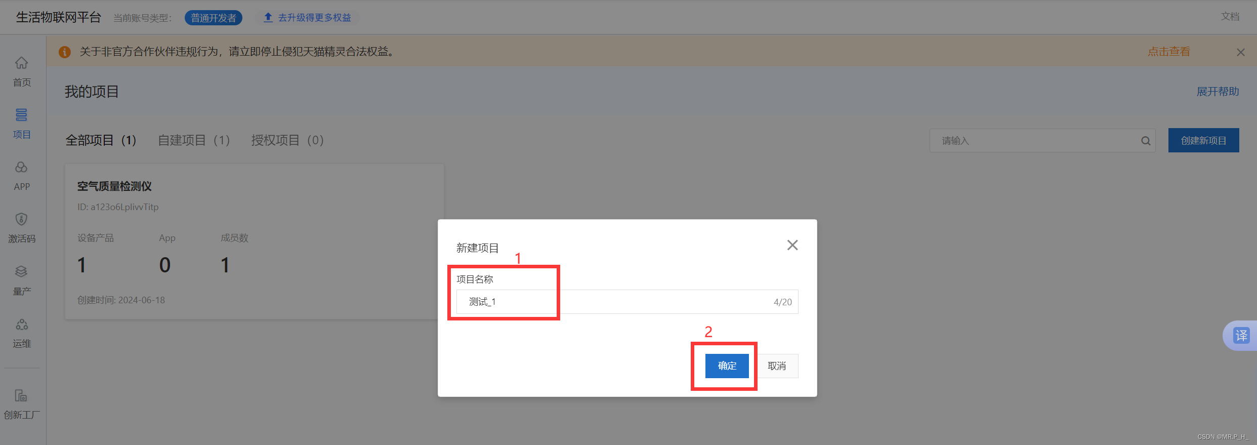 输入项目名称后点击确定(最多四个项目,每个项目可以创建多个产品)